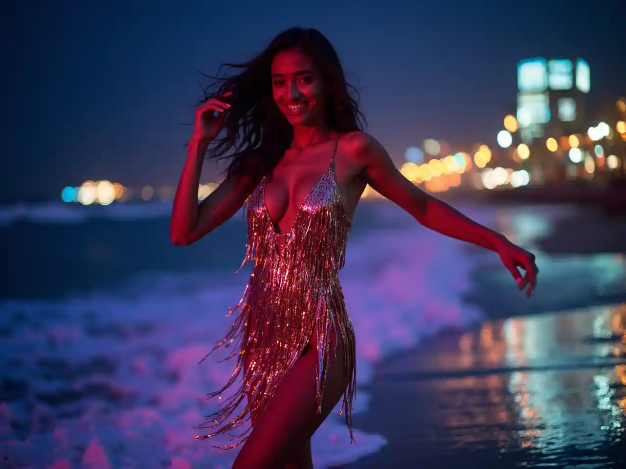Akicheza dansi kwenye bwawa lenye taa za neoni, mwanamke mweusi mwenye umri wa miaka 25 hivi anaangaza katika mavazi madogo ya chuma yenye vilemba. Mawimbi yenye kung'aa na taa za jiji humweka katika mazingira yenye nguvu ya jiji la pwani.