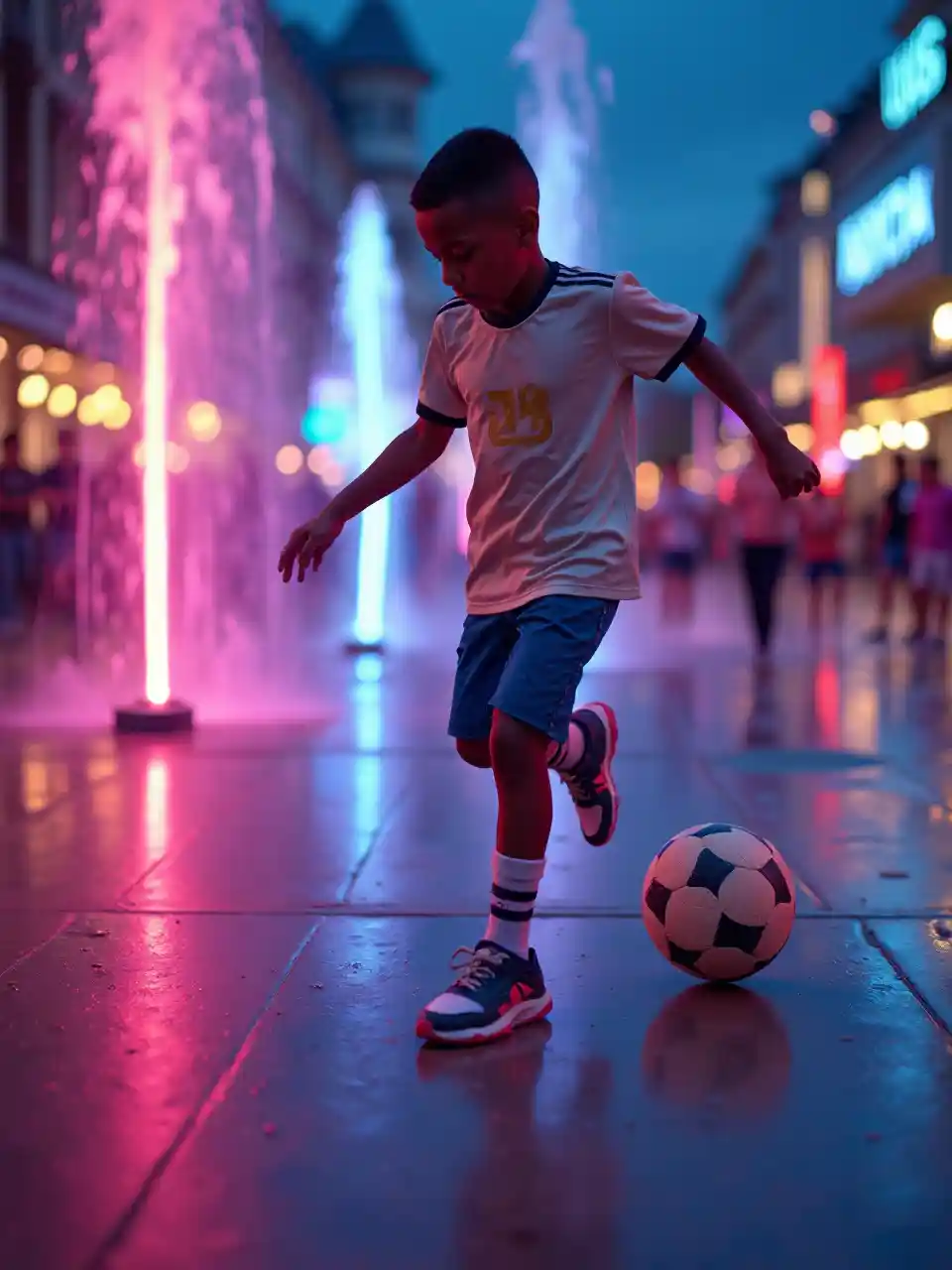 Akikimbia mpira wa miguu katika uwanja ulioangazwa na taa za neoni, mvulana mweusi mwenye umri wa miaka 9 akiwa amechunwa nguo na viatu vya mazoezi. Umati wa watu wenye shangwe na chemchemi za hologramu humweka katika picha, picha zake zenye nguvu zinatoa shauku na nishati yenye nguvu katika eneo lenye shughuli nyingi.