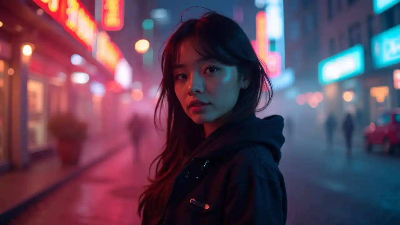 mji mitaani, neon, ukungu, ukubwa, picha ya karibu ya mwanamke kijana katika nguo nyeusi
