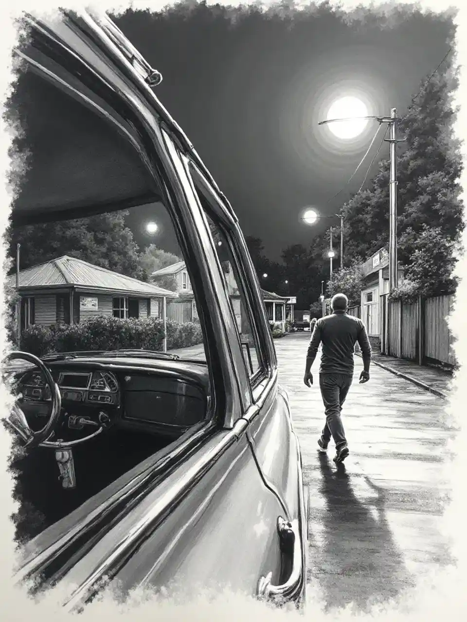 Nathanmkono kuchorwa katika kalamu kijivu risasi picha ya kina ya usiku reflections kwenye dirisha upande wa gari ya mtu kutembea karibu , nyumba ya Australia