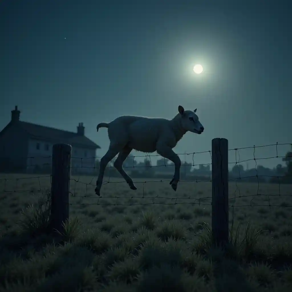 DanielPicha halisi kondoo wachanga kuruka juu ya uzio katika shamba nyuma ya nyumba usiku na mwezi mkali