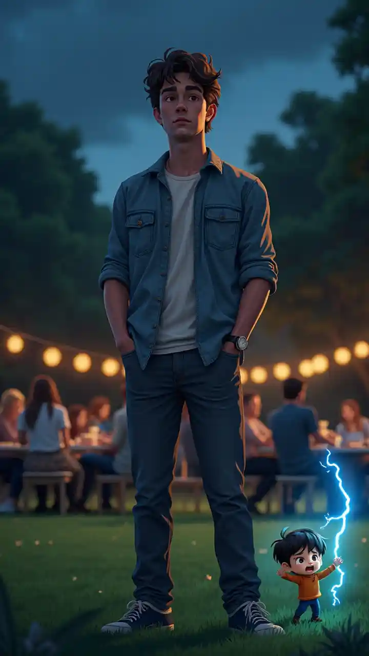 Kijana mmoja anasimama kwa uhakika kwenye nyasi za kijani kibichi chini ya anga la usiku lenye mwangaza wa chini, akiwa amevaa shati ya kijivu yenye rangi ya kijani ambayo huvaa nguo za kawaida. Mtazamo wake ni wa kufikiria, unaonyesha azimio lake anapotazama mbali kidogo na kamera, mikono yake ikiwa imefungwa vizuri. Chini, meza zilizojaa chakula zinaonyesha kwamba kuna karamu, na wageni wanazungumza kwa njia ya busara, na hivyo kuanzisha mazingira mazuri. Ili kukamilisha mandhari hiyo, mtu mdogo aliye hai katika kona ya chini ya picha hiyo hutoa mwangaza mwingi, na mionzi ya bluu huonyesha wakati wa kihistoria, ambao kwa njia ya mchezo, hutofauti na hali ya kawaida. Kwa ustadi, picha hizo zinachanganya mambo halisi na michoro ya uhuishaji, na hivyo kuwafanya watazamaji wafikirie jinsi mambo hayo yanavyohusiana.