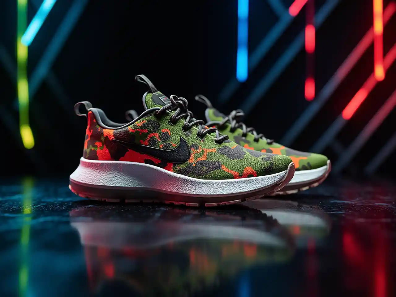 Picha ya kuvutia inayoonyesha viatu vya Nike vilivyo na muundo wa kujificha, na mandhari nyeusi yenye rangi ya neon na picha ya kuvutia ambayo inasisisha muundo wa viatu.