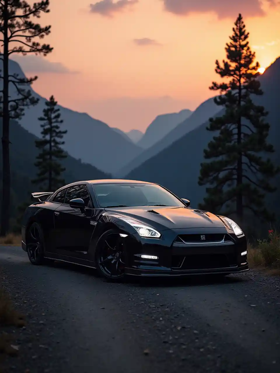 Gari maridadi la Nissan GTR linasimama katika mandhari nzuri wakati wa machweo. Mwili mweusi wa gari hilo unaonyesha rangi za dhahabu na zambarau za jua linalopungua. Mahali hapo panaonekana kuwa penye amani na nguvu, na kuzungukwa na milima na miti. Taa za mbele hutoa mwangaza wa hali ya juu, na hivyo kuchochea hali ya sinema.