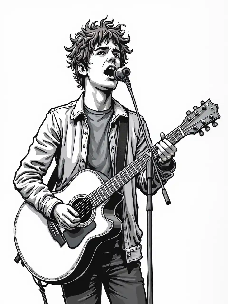 BenjaminNoel Gallagher kuimba oasis na gitaa, comic style, nyeusi na nyeupe wino style, hakuna background, sketchy