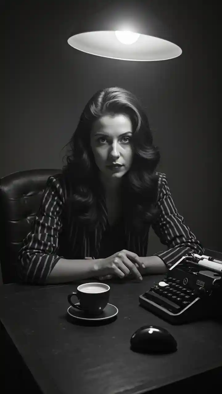 Picha nyeusi na nyeupe yenye tofauti kubwa inachukua kiini cha mwanamke wa kawaida wa miaka ya 1940, anayejulikana kama upelelezi mzuri zaidi duniani. Anakaa kwa heshima mezani, na kikombe cha kahawa moto mbele yake. Nywele zake ndefu zenye kung'aa hufunika mabega yake na kuunda sura yenye kupendeza na macho meusi yanayong'aa, na kupambwa kwa njia ya pekee. Anavalia suruali zenye mistari, na hivyo anaonekana vizuri. Taa ya dari huangaza sehemu ya juu ya paa na kuunda hali ya hewa yenye nguvu, ikionyesha chembe za vumbi zinazotembea hewani. Mazingira ni kamili na mashine ya kuandika ya zamani na keyboard na panya iliyowekwa kimkakati, ikimaanisha njia zake za kisasa za uchunguzi. Uwepo wake ni wa kiongozi na wa kifahari, kwa kuwa anaonyesha ushawishi wa muda na akili ya upelelezi binafsi katika mazingira ya sinema ya miaka ya 1940.