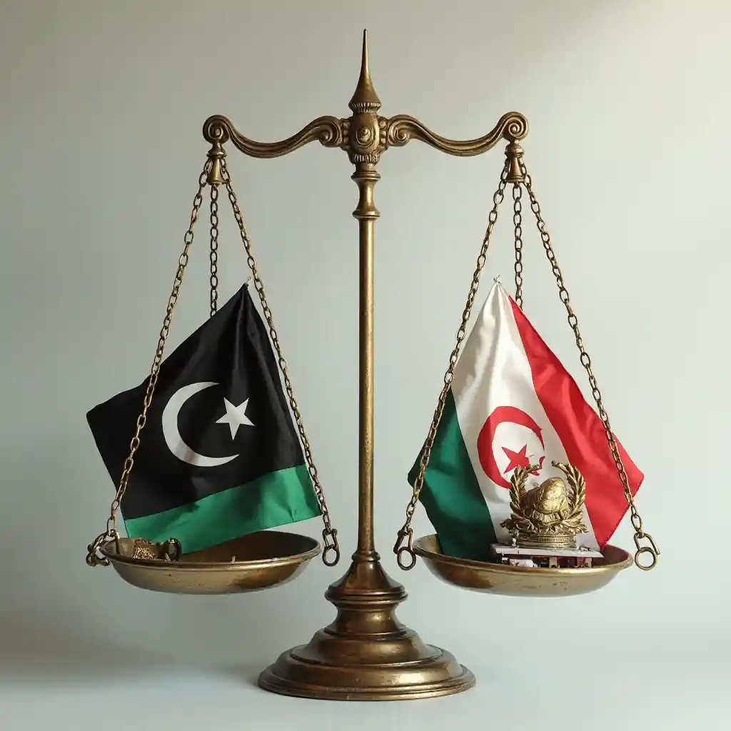 Picha halisi ya ukubwa wa usawa, upande mzito unaonyesha bendera ya Libya, ikilinganishwa na upande mwepesi unaoonyesha bendera za Tunisia na Algeria pamoja na picha ndogo ya mpaka wa Afrika.