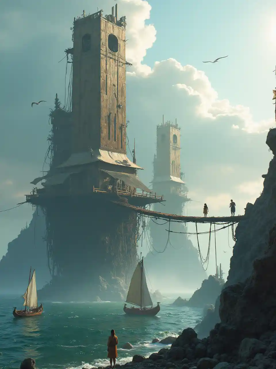 Miundo mirefu ya baada ya mwisho wa dunia iliyotengenezwa kwa mbao , karatasi za chuma na takataka zinazoinuka kutoka baharini . Mabango ya mbao na madaraja ya kamba yanayowaunganisha . Ndege wenye matanga wanaotembea juu ya maji . Watu wakiwa wamevaa nguo zilizokuwa zimebomoka . Mawingu ya chini yaliyoelea kati ya majengo juu ya bahari . Nyani wakipaa kupitia ukungu . Nuru ya jua