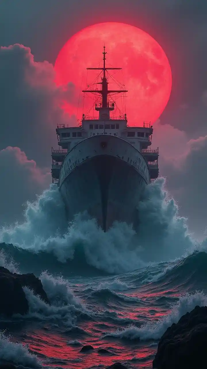 Mawimbi makubwa sana yakivunja meli kubwa. Mazingira ya kutisha. Jua jekundu linaloteketea