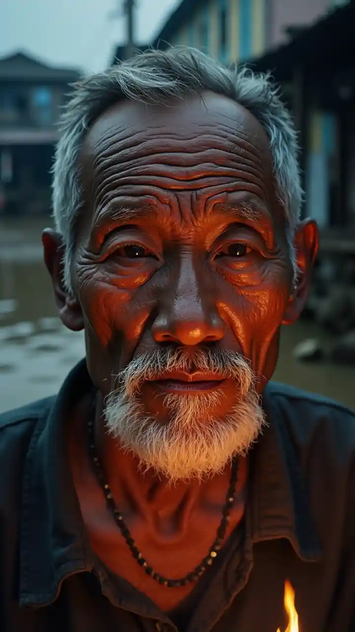 Picha ya karibu ya uso wa mwanamume mzee wa Vietnam, akiangaziwa na mwangaza wa moto, na mandhari ya mto mchafu na mji wa mashambani.