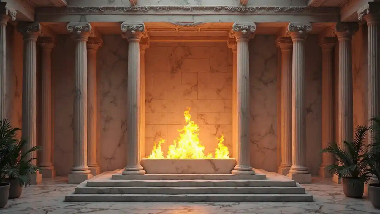 Madhabahu ya marumaru na moto katika mtindo wa Kigiriki kwenye mlima wa Olympus, iliyo na mambo mengi