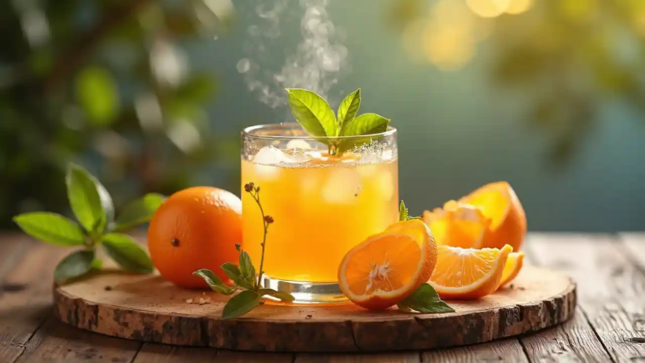 ColtenMaji, siki na harufu ya machungwa juu ya meza ya mbao, na maua karibu na atomizer, inaonekana kutoka juu