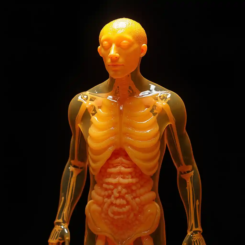 Picha ya mtu wa rangi ya machungwa iliyofumwa kutoka kwenye matunda ya machungwa, viungo vinaonekana kupitia kwenye jelly, background nyeusi