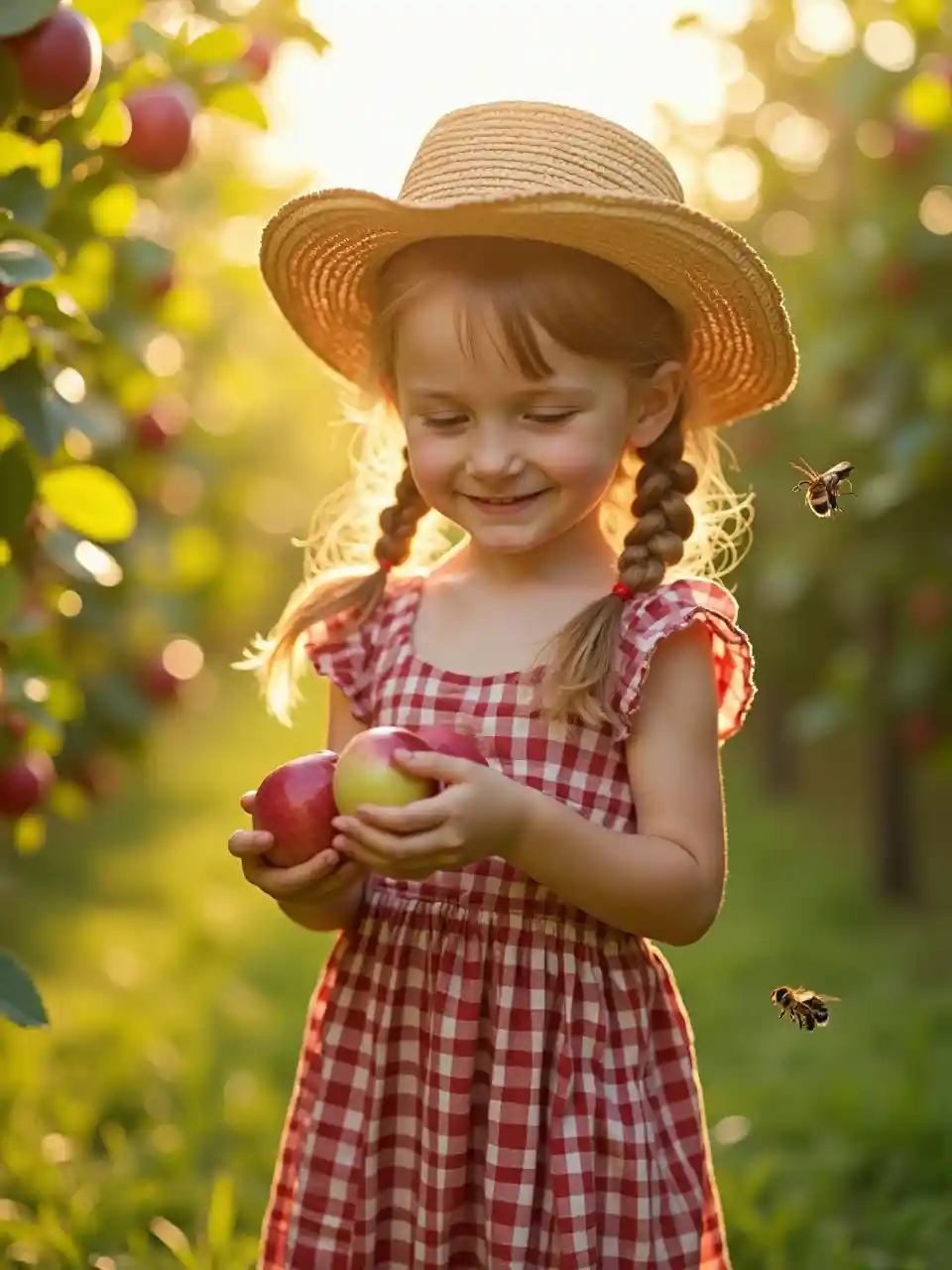 Akiokota maapulo katika bustani, msichana mweupe mwenye umri wa miaka 7 mwenye mikia ya nguruwe, amevaa mavazi ya nguruwe na kofia ya matete. Nuru ya jua ya dhahabu na nyuki wanaopuliza humweka katika mazingira mazuri, na nywele zake zenye uangalifu hutoa nuru ya uadilifu na furaha ya jua.
