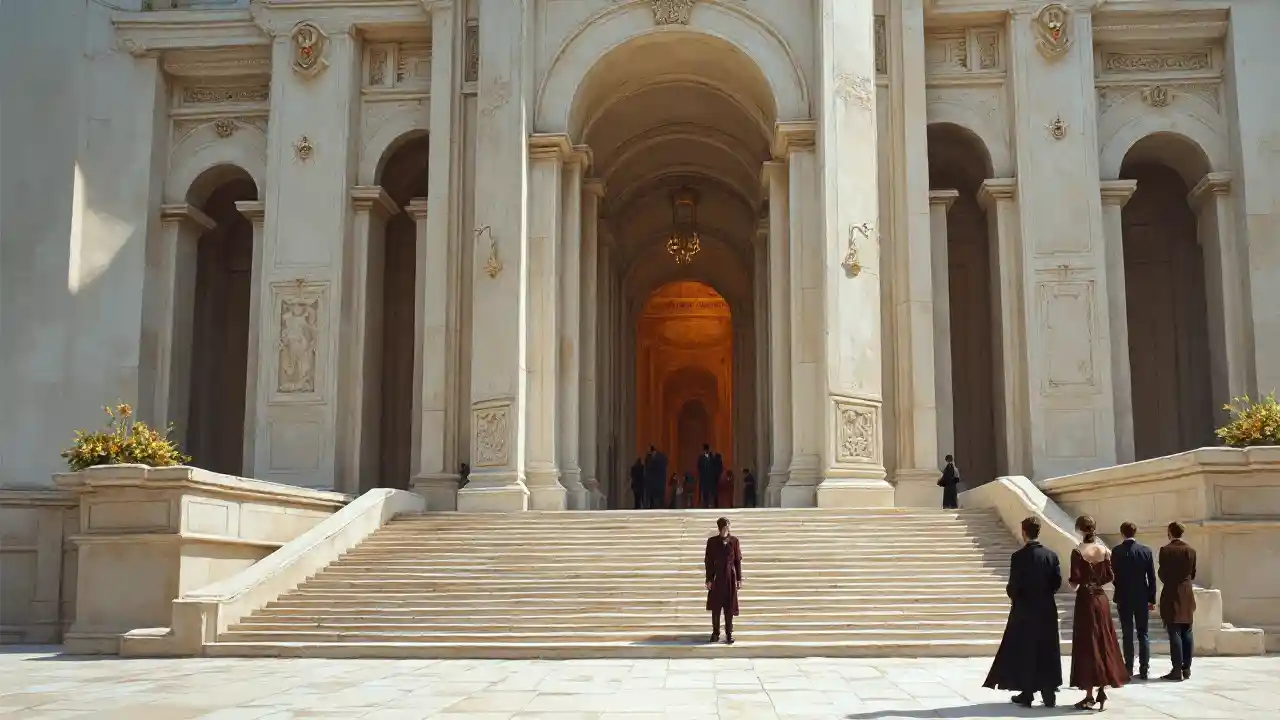 Kuvutia, mapambo, marumaru jengo na ndege ndefu ya ngazi kuongoza, mchanganyiko wa neoclassical na futuristic, na ujumbe kifahari kusubiri wageni muhimu katika mlango wa mbele, sci-fic rangi ya mafuta.