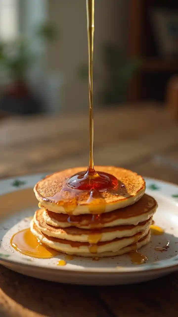 Milasahani ya pancakes kuruka, maple syrup dripping, picha
