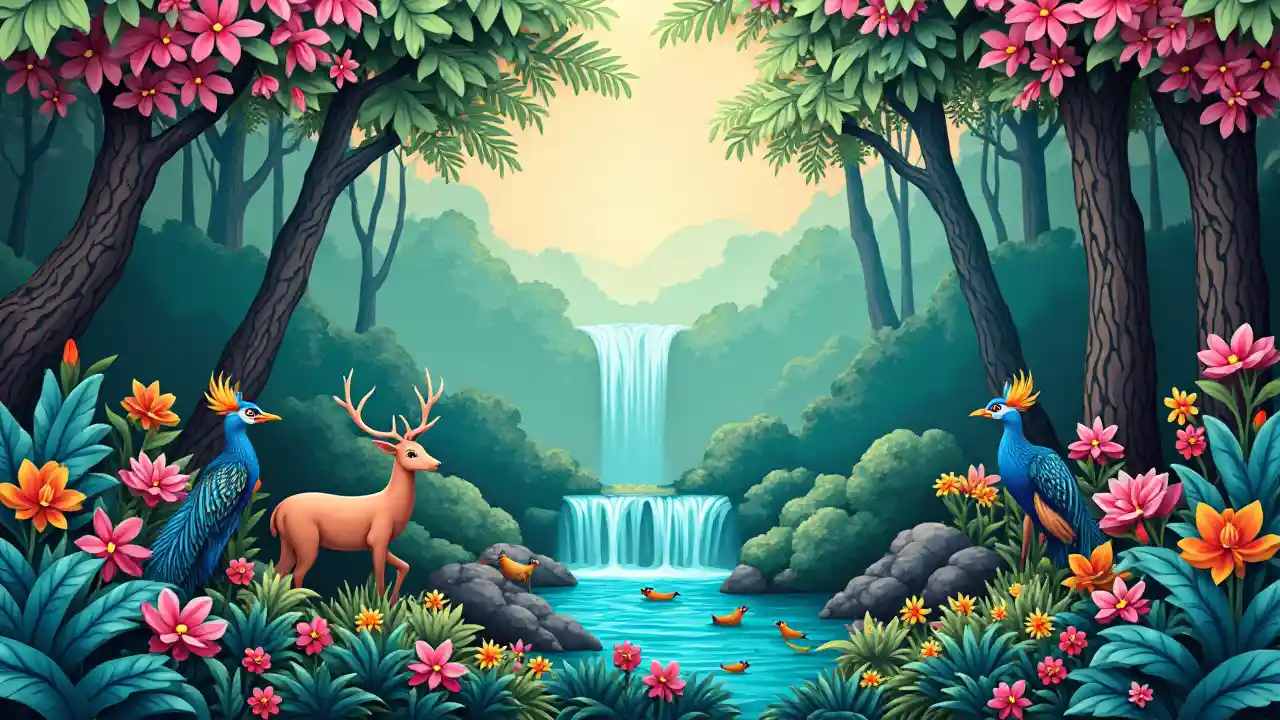 Uumbaji wenye rangi na misitu na maporomoko ya maji na nyani, ndege wa peponi, vipepeo na wanyama wengine wa msitu