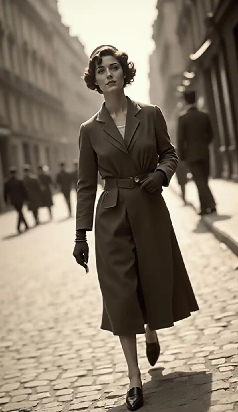 Picha ya rangi ya sepia, inayoonyesha mwanamke aliyevalia vizuri akitembea kwenye barabara za Paris, miaka ya 1930