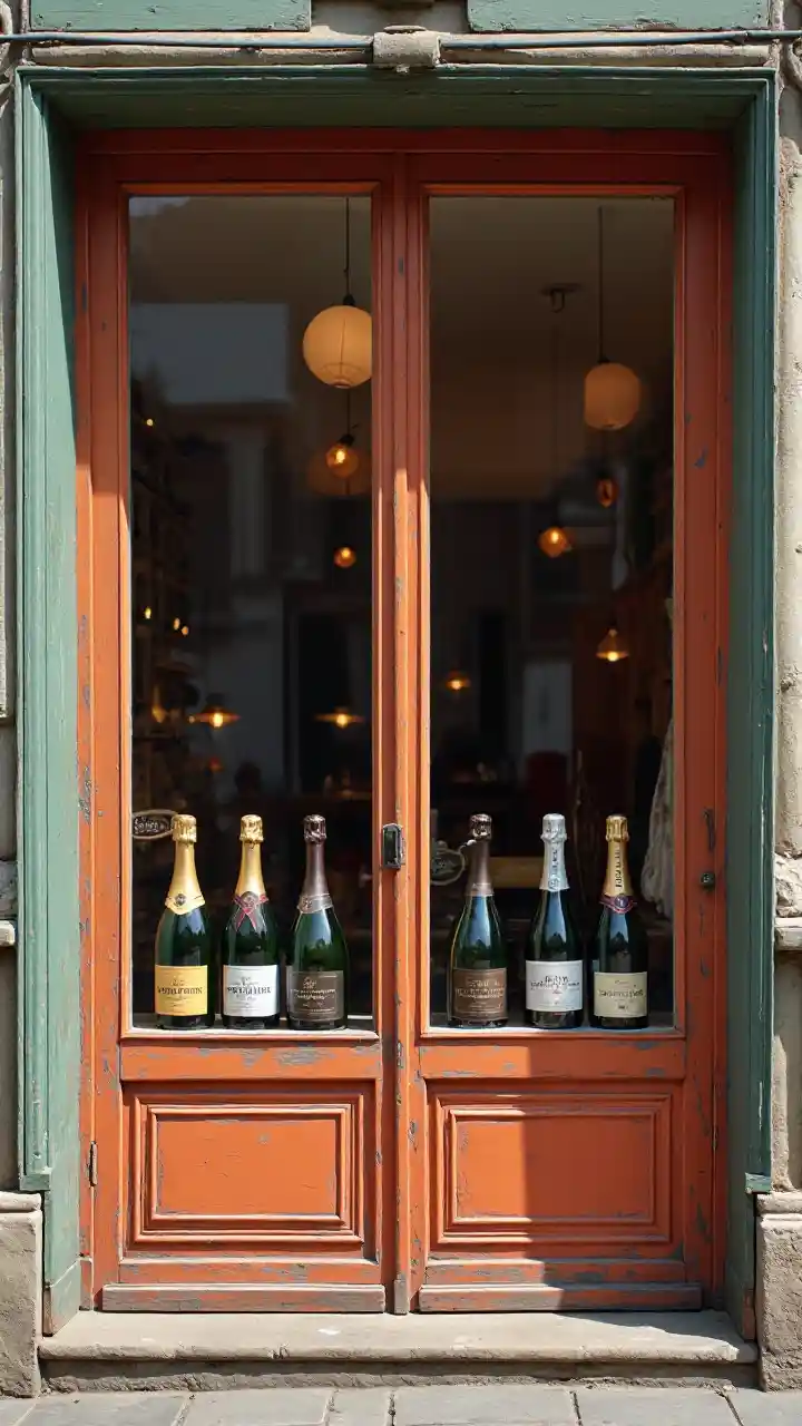 Robinrangi ya mbao ya zamani Paris duka mbele na chupa 5 za champagne ndani