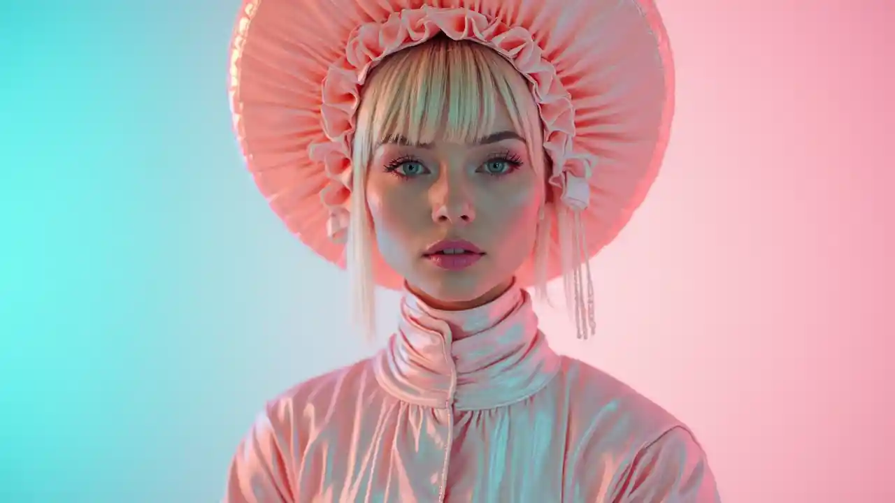 Nzuri blonde mwanamke pop msanii wote pastel kifahari futuristic mavazi, na kubwa kipaji cha kichwa katikati kipande, safi makeup, na kina cha uwanja, ajabu makali na mfalme mandhari mavazi, hawakupata katika rangi, incarning kiini cha fantasy, minimalist