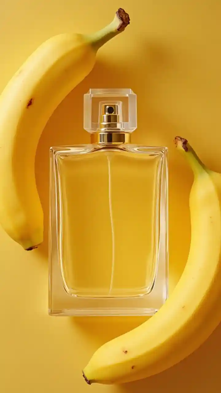 Gabrielkupiga picha kitaalamu ya manukato ya kifahari, chupa mraba, kuzunguka ndizi, hakuna lebo, wazi, mockup
