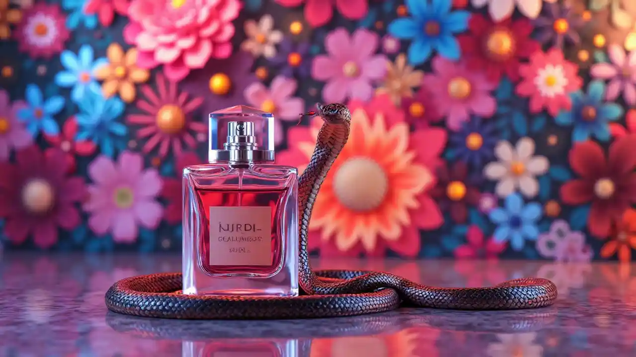 Audreychupa ya manukato ya minimalist, nyoka kando ya chupa mbele ya rangi ya neon Wallpaper ya maua mengi