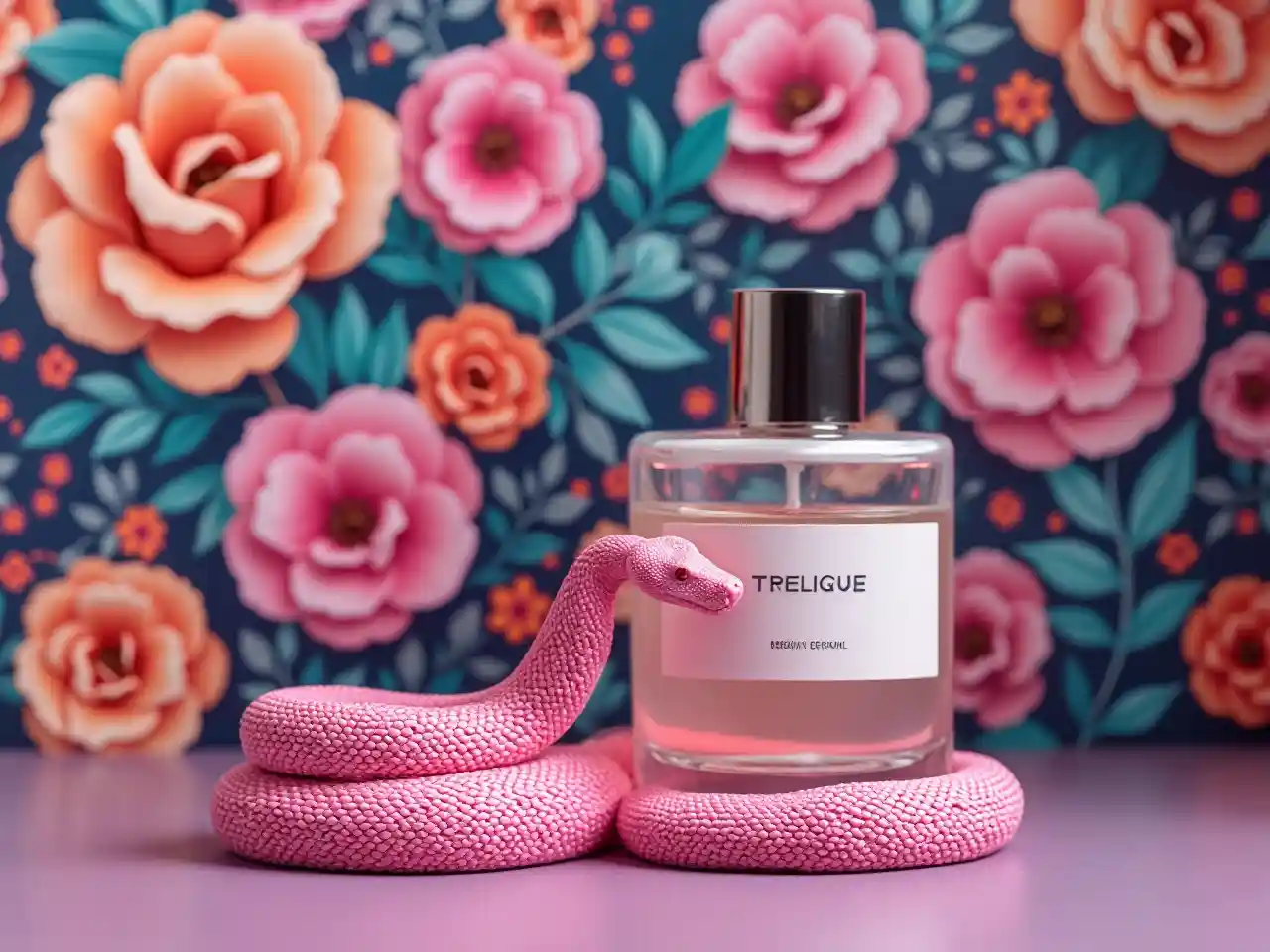 Sawyerchupa ya manukato ya minimalist na nyoka wa rangi ya waridi kando ya chupa mbele ya karatasi ya ukuta ya maua yenye rangi ya neon,