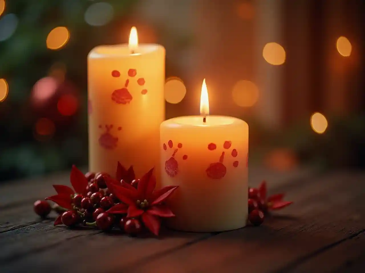 (mwenye kung'aa mshumaa), joto anga, mwanga laini flickering, (translucent blurred background), rangi ya Krismasi, matajiri nyekundu na kijani, utulivu na upole anga, bora kwa ajili ya kumbukumbu kwa wanyama, kuwakaribisha na faraja vibe, utulivu athari, kamili kwa ajili ya vyombo vya habari kijamii, ubora wa juu, ultra kina, iliyoundwa kwa kumbukumbu ya moyo. ni pamoja na alama ya miguu kwenye mshumaa