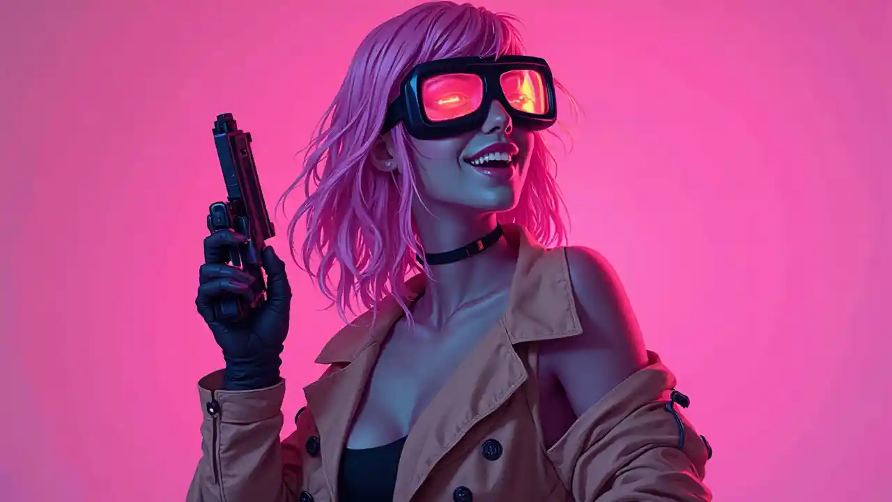 (swat mtu), (pixel sanaa), kina, mwili, kinga, mask, miwani, action pose, trench coat, pink, surreal, weird, (mwili kamili sexy gamer msichana na nywele pink picha), vaporwave neon theme, mwanamke, picha, tabasamu, kicheko, kinywa wazi, (mwili wa juu, bust risasi, kuangalia mbali:1.1), nywele neon, (hakuna nguo)