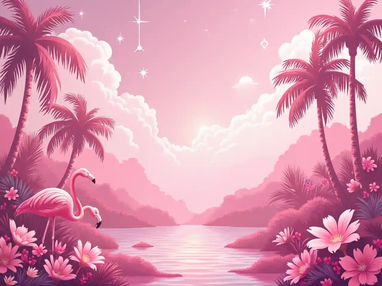 Paradiso ya waridi, mandhari ya waridi, mawingu ya ajabu, nyota za waridi, flamingo za waridi, maua ya kitropiki, na mitende.