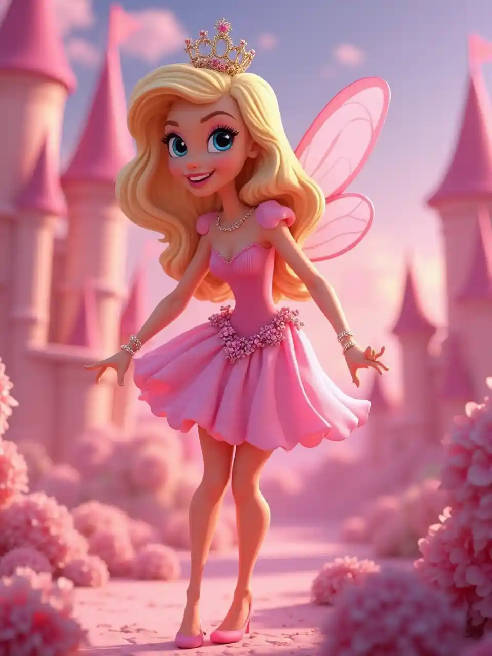 Fikiria mwili kamili haiba 3D cartoon ya Farrah Fawcett kama pink Fairy moja nje ya Disney filamu juu ya nyuma ya ngome