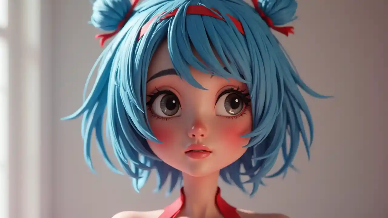 Disney 3D Pixar style mwanamke tabia na nywele fupi za bluu na mistari nyekundu, alama nyekundu juu ya mashavu yake