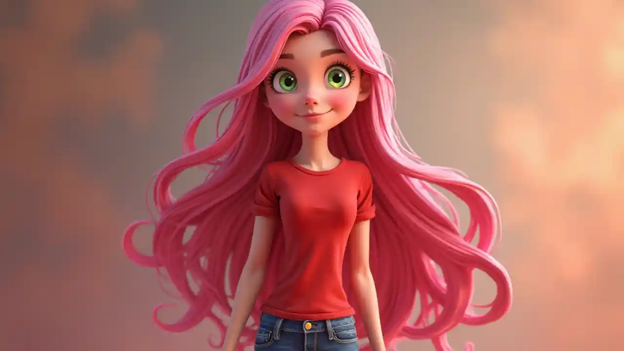 Pixar 3D bango, msichana na nywele ndefu nyekundu, macho ya kijani kuvaa shati nyekundu na jeans