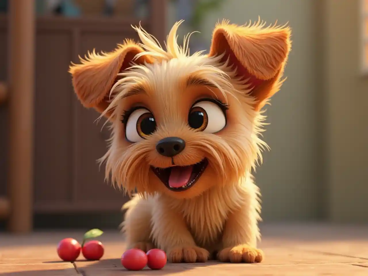 Disney Pixar-aliongoza filamu bango na kichwa "Rikki". Katika picha ya Yorkshire Terrier nyepesi na masikio ya kahawia na pua ya waridi kando, na macho ya kahawia na tabasamu uso. eneo lazima katika tofauti digital sanaa mtindo wa Pixar, na lengo la tabia, rangi hai, na textures kina ambayo ni tabia ya uhuishaji, na jina"Bigornas"
