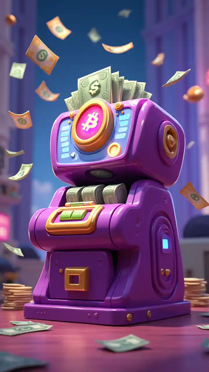 Pixar style movie, capricious zambarau na dhahabu fedha kuhesabu mashine, kubadilisha cryptocurrency katika fedha, rangi ya nguvu, taa ya nguvu, maelezo cartoonish, mazingira ya kucheza, ubora wa picha, curves laini na kingo, bili kuruka kote, wahusika animated kuingiliana na mashine, background cinematic kuonyesha dunia ya kisasa ya fedha, ultra- kina na furaha.
