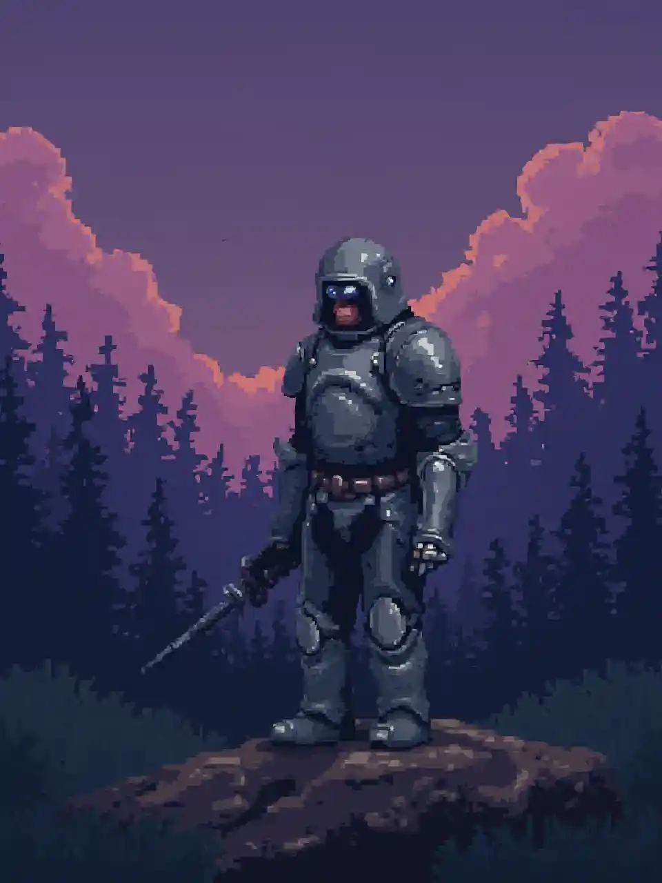 8-bit pixel sanaa, mraba pikseli swamp, rangi gorofa, askari huzuni na silaha za fedha, anga zambarau na mazingira ya giza