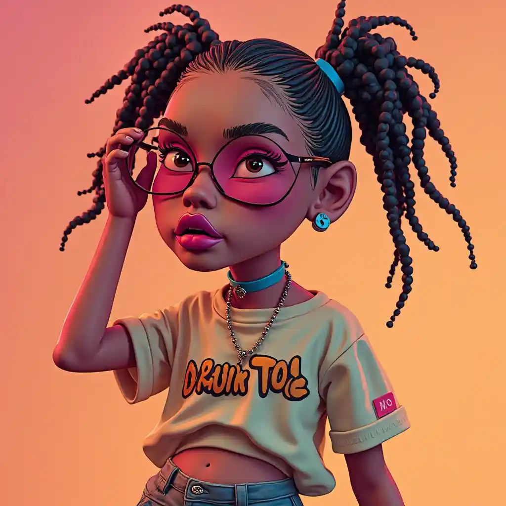 Katika mtindo wa plastiki ajabu. 3D tabia, hip hop, hip hop msichana, kuvaa ace & tate miwani, oversized shati, vinyl tabia.