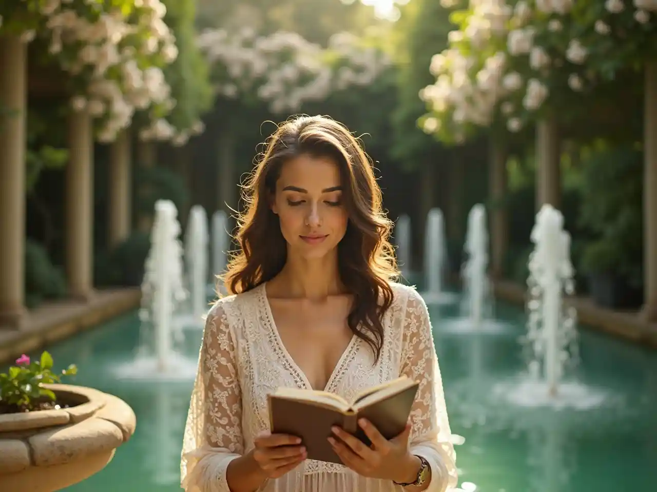Akisoma mashairi kwenye ua wenye rutuba, mwanamke wa Mashariki ya Kati mwenye umri wa miaka 25 huangaza katika bluu ya la. Vyanzo na jasimi humweka katika mazingira yenye utulivu.