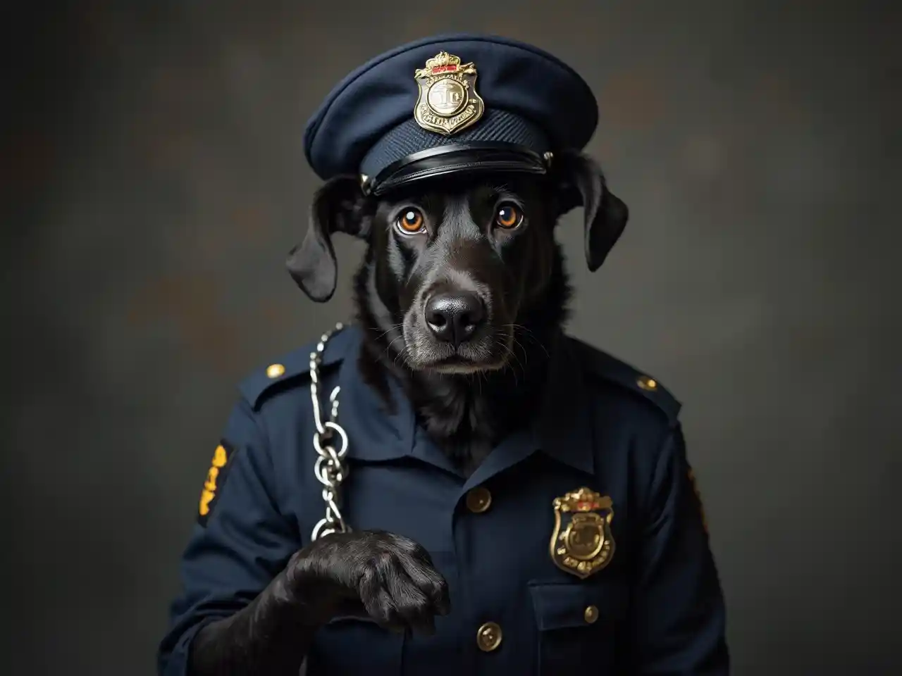 Mbwa Mweusi Katika Nguo ya Polisi na Vifungo