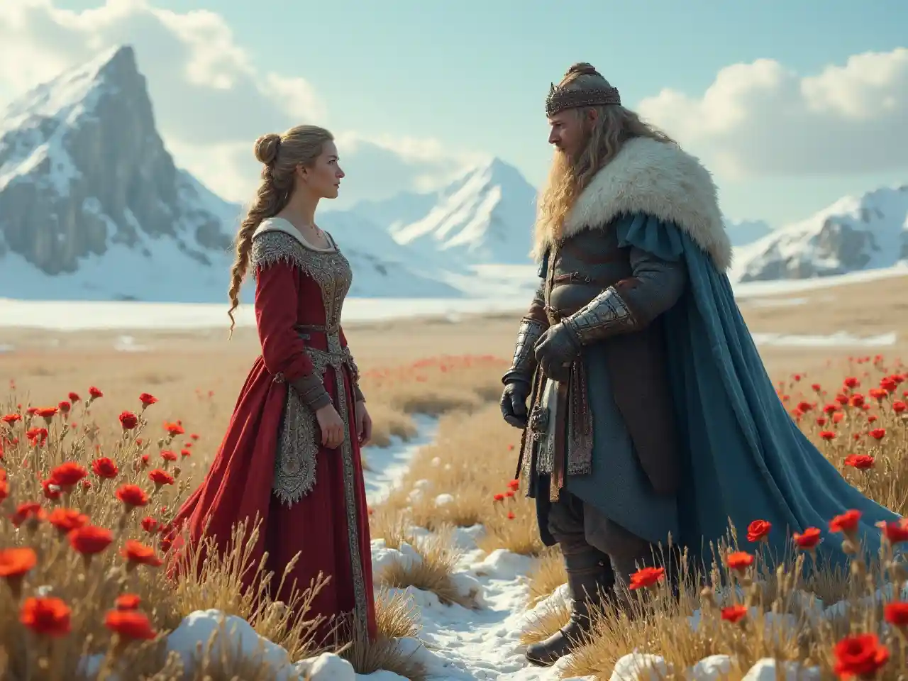 unaweza kuunda mwanamke Slavic Kipolishi katika mavazi kukutana Viking Norway katika suti yake ya vita. upande wake unaweza kuona mashamba mazuri ya ngano, maua nyekundu na upande wake unaweza kuona barafu na theluji kila kitu kina, mythological na kichawi.