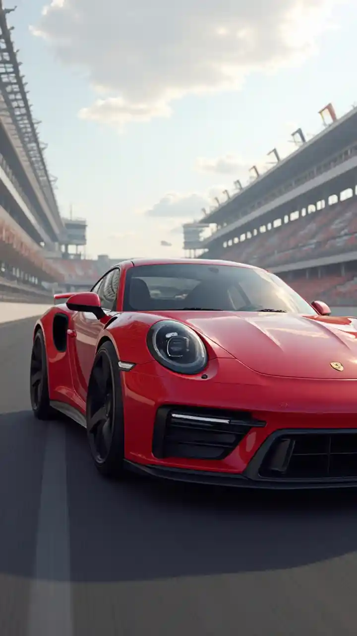 Leila2024 carmine nyekundu Porsche 911 Turbo coupe michezo gari na ukanda nyeusi na pua nyeusi na mwanga, photorealism, utoaji wa kweli, utoaji wa kompyuta, Indianapolis Motor Speed