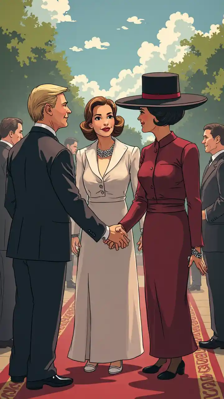 Rais na mwanamke wa kwanza ni kuwakaribisha wanandoa wengine, mwanamke wa kwanza ni kuvaa kubwa nyeusi rimed kofia na ukanda nyeupe. kujenga eneo hili katika gazeti strip style anime na paneli 4 na rangi ya msingi