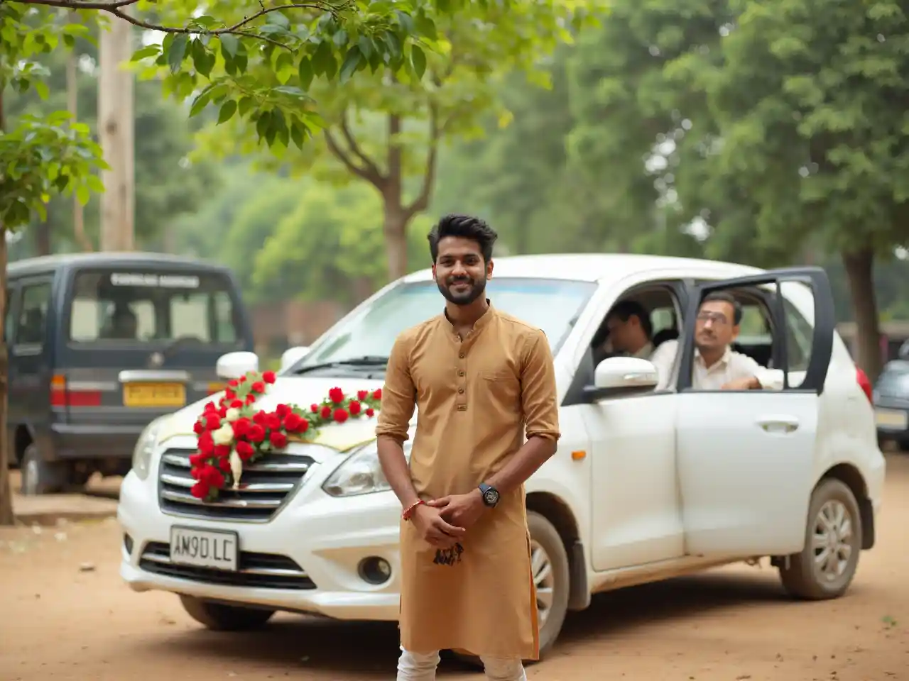 Kijana mmoja aliyevaa mavazi ya kitamaduni ya rangi ya kahawia, akiwa amesimama kwa uhakika kando ya gari jeupe lililopambwa vizuri, anaonyesha kiburi na sherehe. Gari hilo limepambwa kwa waridi wenye rangi nyekundu na mistari mizuri, ikidokeza pindi ya sherehe - labda harusi au tukio la pekee. Mbele yake, mtu ameketi ndani ya gari dogo na hilo linafanya watu wawe na furaha zaidi wakiwa nje, wakiwa wamezungukwa na mimea mingi na nuru ya mchana. Maono hayo yanaonyesha shangwe na kutazamia kwa hamu, na hivyo kuonyesha waziwazi wakati muhimu katika maisha ya kijana huyo, na pia udongo ulio chini ya miguu yake unaonyesha kwamba sherehe hiyo ilikuwa ya kawaida. Rangi hizo ni zenye uchangamfu na zinafanya picha hiyo iwe yenye furaha.