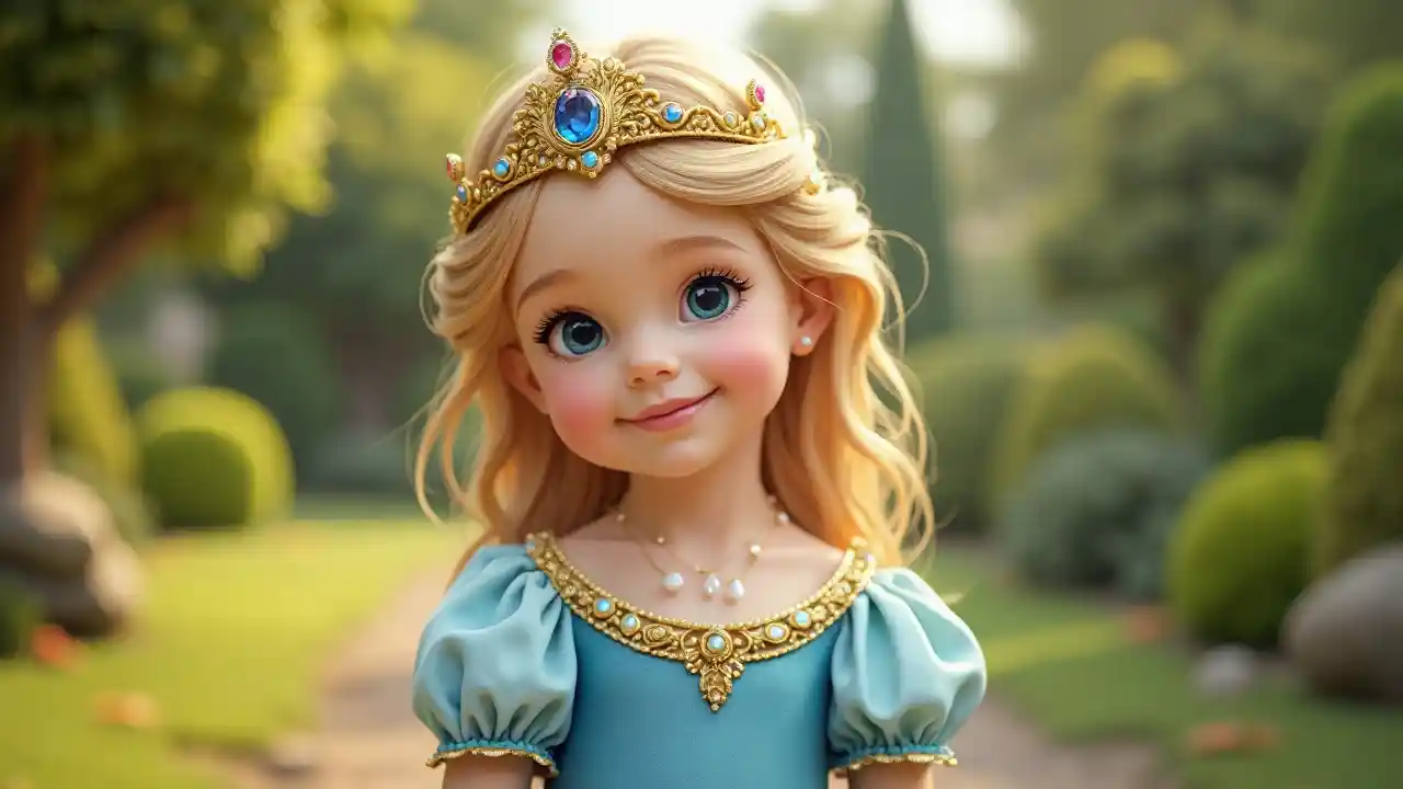 Binti mdogo wa kifalme mwenye ngozi nyeupe na nywele nyeupe, amevaa kilemba na mavazi ya bluu yaliyopambwa kwa vito vya dhahabu na lulu, nyuma ya bustani yenye miti na vichaka mbalimbali, hali ya hewa ya jua, rangi za juu, maelezo ya juu