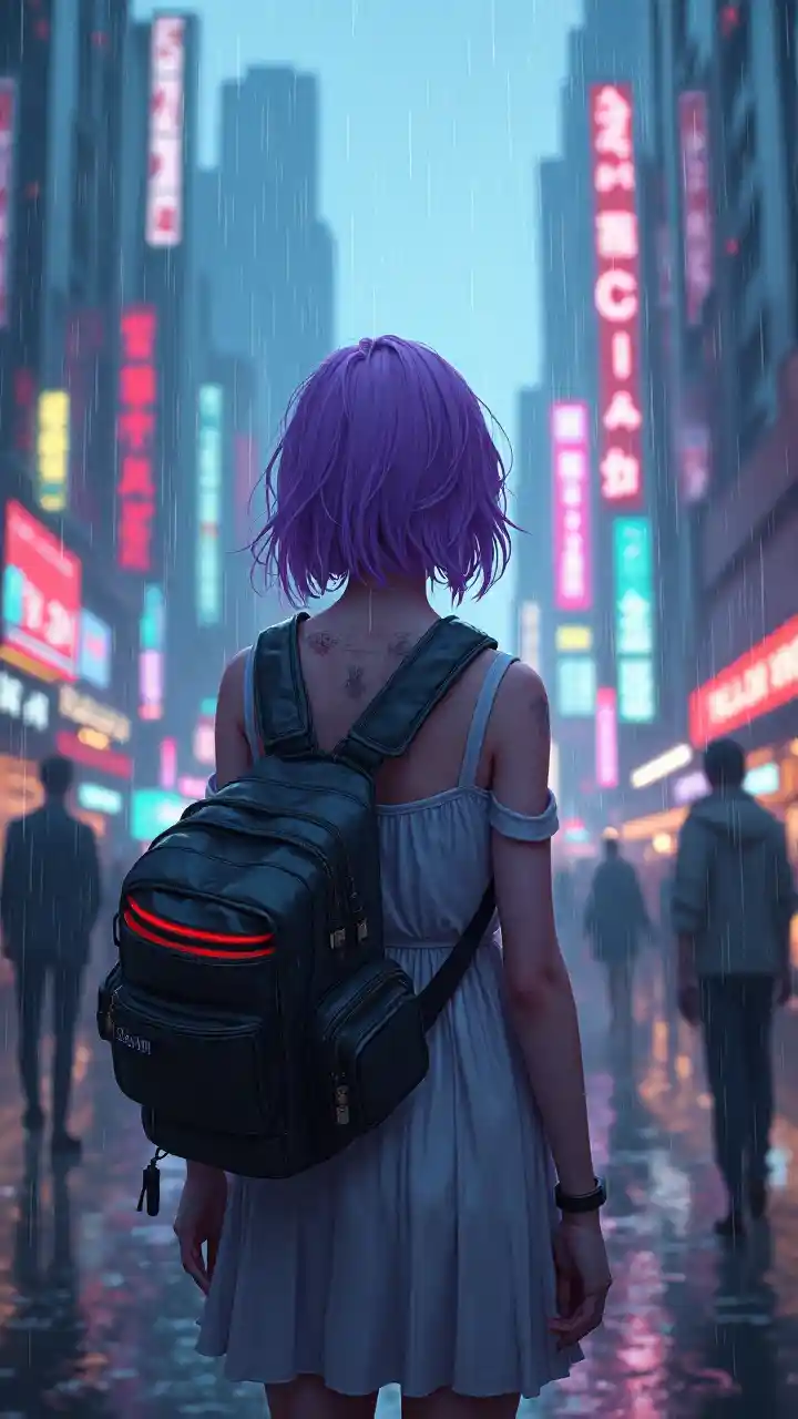 Chloe(masterpiece, ubora bora),1msichana na nywele zambarau kuangalia anga amesimama katika shughuli cyberpunk mitaani,mvua siku ya taa,vazi ya baadaye,mbele blur