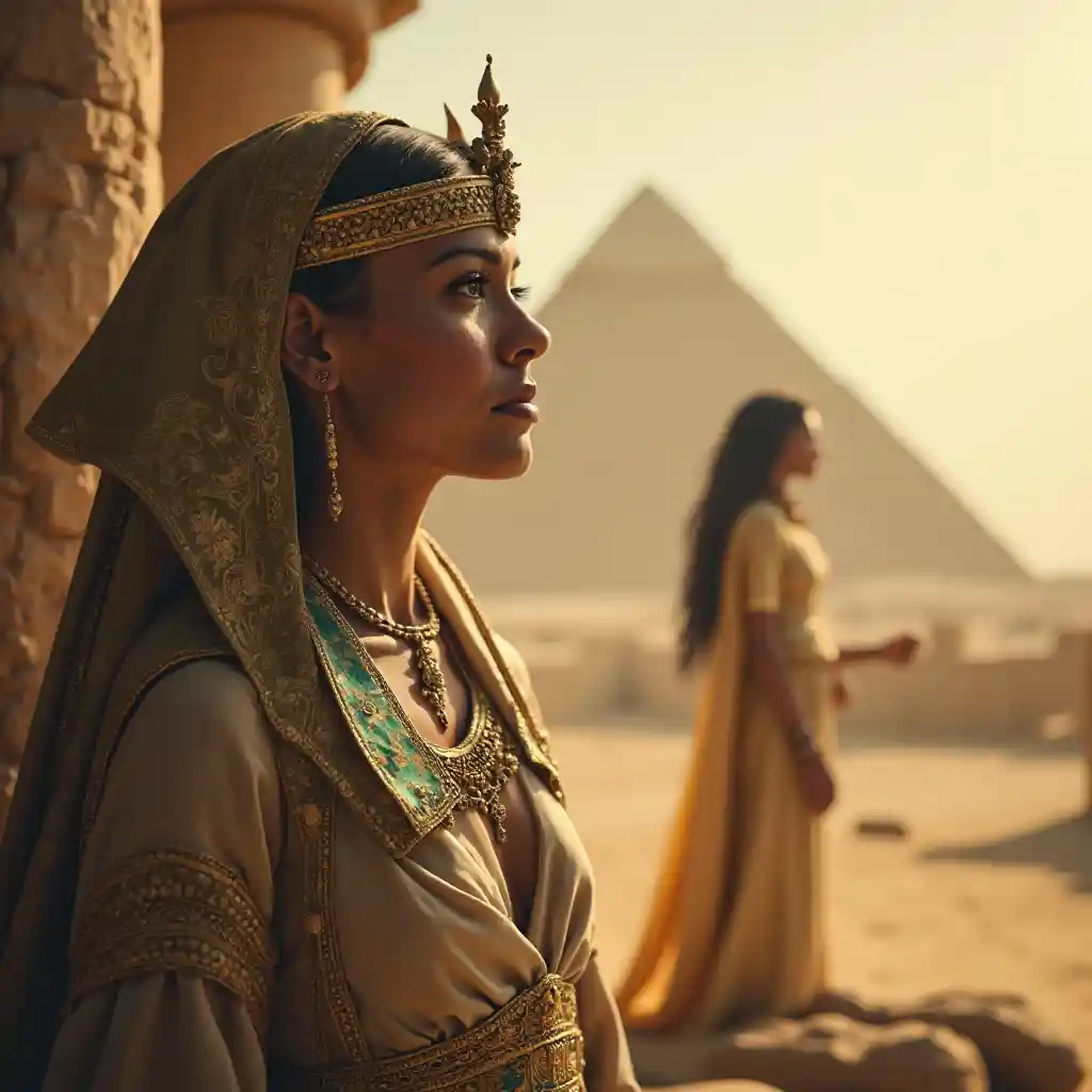 (Picha ya mwili wote) Katika Misri ya kale, malkia mzuri ((masharti ya uso yenye maelezo), aliyevaa mavazi ya kawaida, alisimama kando ya Sphinx Mkuu, akipokea pongezi ya watu. splash sanaa, hyper kina, ultra kweli, kina sana, surreal ukungu nzito, studio kamili taa, shading kamili, tofauti impeccable, HDR, UHD, high resolution, 64k