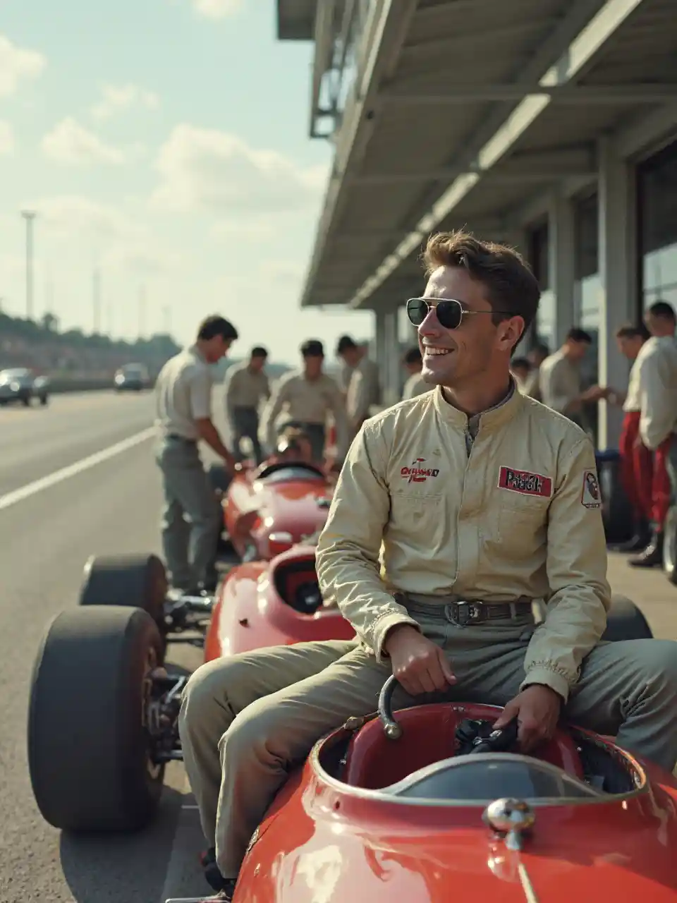 Samuelmbio track, pit kuacha, timu ya mitambo, dereva wa gari katika mstari wa mbele, furaha, miwani ya jua, ameketi juu ya gari, picha ya zamani, kina sana