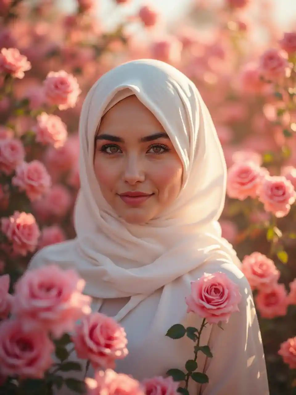 (زیبای نورانی دختری) amesimama katikati ya maua ya waridi, uso wake umefungwa kwa upole katika mwanga laini, wa dhahabu na kuunda athari ya hewa, akivaa hijabu nyeupe ambayo inatozana kwa upole na vivuli vya rangi ya rangi ya rangi ya rangi ya rangi ya rangi ya rangi ya rangi ya rangi ya rangi ya rangi ya rangi ya rangi ya rangi ya rangi ya rangi ya rangi ya rangi ya rangi ya rangi ya rangi ya rangi ya rangi ya rangi ya Hali ya hewa ni yenye kupendeza na yenye kupendeza, na rangi ya waridi ni nyembamba sana. Ubora wa picha hiyo ni wa kina sana, na hivyo kuifanya iwe wazi na yenye kuchochea kiroho.