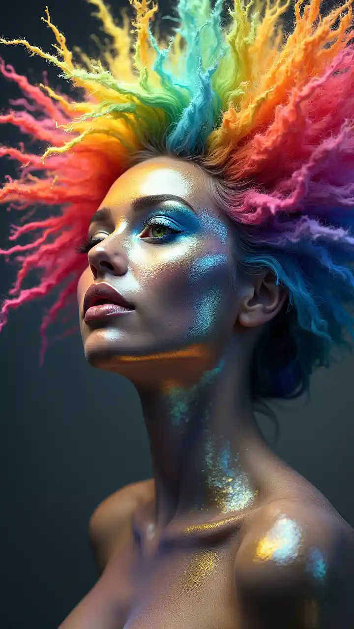 Full rangi uso mwili picha ya mwanamke na fedha na dhahabu ngozi juu ya uso na mwili, upepo wa ajabu upinde wa mvua gradient nywele, kulipuka kichwa rangi, macho ya wazi ya kijani, mwanamke, vumbi, rangi, azimio la juu, kina, rangi ya neon, abstract, kitaaluma, radi