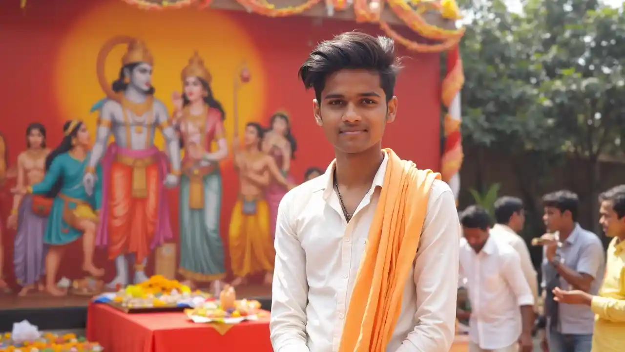 Kijana mmoja anasimama kwa uhakika mbele ya sherehe yenye msisimko ambayo ina picha kubwa za miungu, ikionyesha kwamba Ram Navami ni sherehe. Anavaa shati jeupe lenye rangi ya machungwa na mshipi wa rangi ya rangi ya rangi ya manjano uliowekwa juu ya bega lake, na hilo linatimiza sehemu hiyo yenye rangi nyingi, ambayo pia inatia ndani vitambaa vya mapambo na matoleo yaliyowekwa kwenye meza iliyo karibu, ambayo ni ishara ya utamaduni au sherehe ya kidini. Kazi hiyo ya sanaa inaonyesha waziwazi Bwana Rama, akiandamana na Mungu wa kike Sita na watu wengine, wakiwa na mandhari yenye kuvutia ambayo huongeza hali ya sherehe. Mwangaza ni mkali na wa kawaida, na unaonyesha tukio la mchana, na mandhari yote inaonyesha shangwe na roho ya ushirika wakati watazamaji wanapojiunga na sherehe hiyo. Hali ya hewa inaonyesha heshima na sherehe, na hivyo kuonyesha maana ya tukio hilo muhimu.